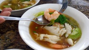Kemudian ditambahkan olah laut lainnya berupa udang atau potongan cumi, sayuran segar dan potongan tomat hijau. Rasa sup ini gurih dengan ciri khas rasa asin, asam dan campuran kaldu yang berpadu.