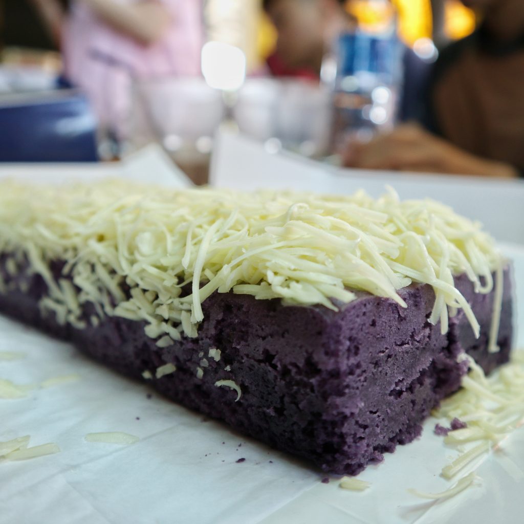 Berbeda lagi dengan tampilan Taro Cheese. Menggoda dengan cake berwarna purple dan irisan keju yang ditumpuk di atasnya. Warna Purple ini adalah berasal dari pewarna alami dari adona Taro. Kita lebih familiar menyebutnya Talas!