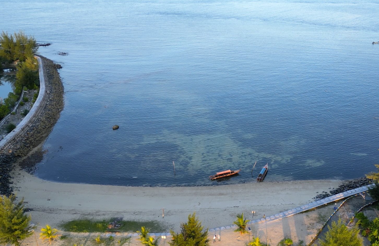 Di sisi selatan, dermaga beton masih berdiri setengah jadi, tak kunjung selesai sejak 2019. Nelayan akhirnya tetap menurunkan pengunjung langsung di tepi pantai.