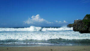Setibanya di pantai, pengunjung langsung disambut pemandangan laut biru dengan ombak tinggi yang menghantam tebing-tebing karang.