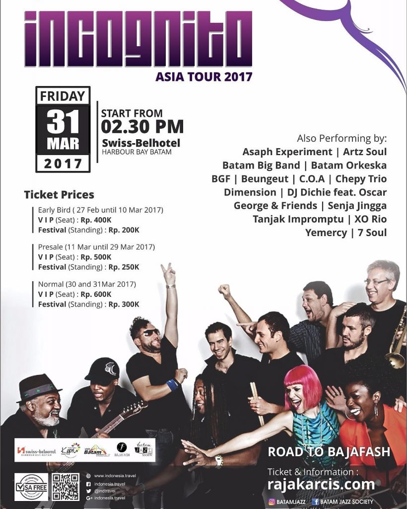 Incognito direncanakan tampil berdurasi sekitar 90 menit dan formasi lengkap 15 orang personil termasuk crew yang terbang langsung dari London ke Singapura. Dalam konser penampilannya nanti, Incognito membawakan beberapa nomor hitsnya yang mendunia, seperti “Night Over Egypt”, “Still a Friend of Mine”, “Don’t You Worry ‘Bout A Thing”, dan banyak lagi. Selain Incognito, acara WIMF2017 akan dimeriahkan oleh beberapa grup band terbaik dari kota Batam dan sekitarnya. BJS mengharapkan WIMF2017 agar kegiatan musik skala internasional lebih sering diadakan di Kepri dan Batam. (*)